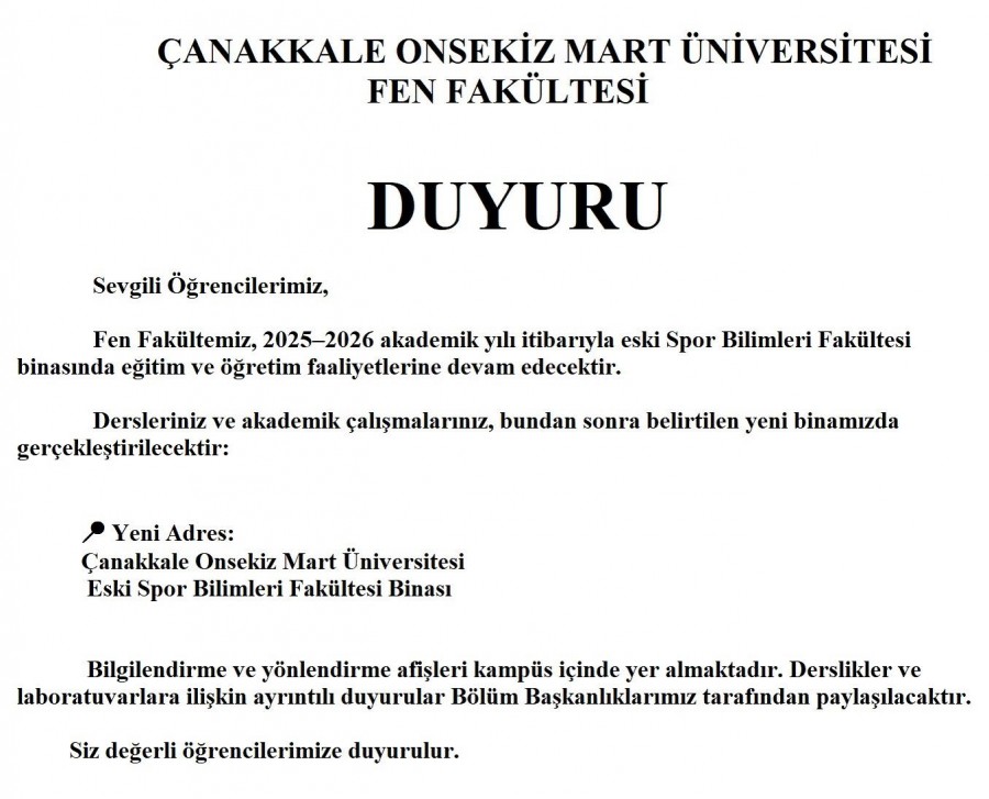 FEN FAKÜLTESİ BİNA DEĞİŞİKLİĞİ DUYURUSU